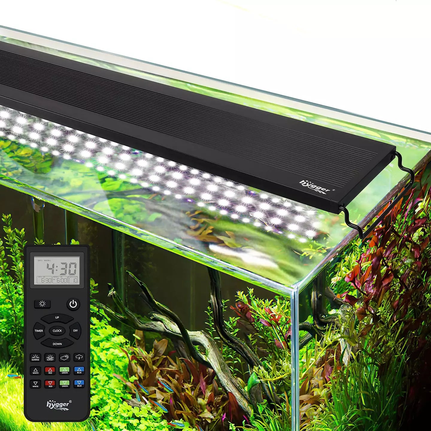 En av de stora fördelarna med HG016 är att det kommer med en fjärrkontroll med LCD-display, så du enkelt kan justera ljusstyrka, färgtemperatur och timer direkt utan att behöva klättra fram till akvariet. Det gör det enkelt att skapa en mjuk övergång från soluppgång till dagsljus och vidare till kvällens “månsken”, vilket kan hjälpa till att efterlikna naturliga ljuscykler.
